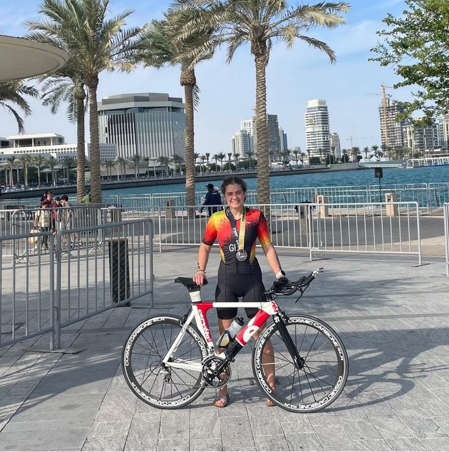 Hier galt es die folgenden Teilstrecken zu bewältigen: 2 Kilometer Schwimmen, 80 Kilometer Radfahren und abschließend 18 Kilometer Laufen. Nach dem Start an der Küste des arabischen Golfes ging es auf die manchmal wellige und raue Schwimmstrecke im Salzwasser, eine besondere Herausforderung. Johanna absolvierte diese Disziplin in einer Zeit von 50 Minuten und 19 Sekunden.